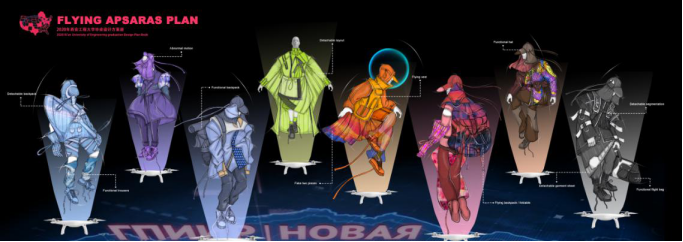 《飞天计划》主题设计灵感来源于从古至今人类对于飞天的畅想,《妖猫传》中杨贵妃荡秋千一个镜头感受到飞天的自由以及大唐的盛世,于是我想要将传统的飞天想法和未来创新碰撞,最终落脚到了目前最新的极限运动“翼装飞行”,这种服装像鸟儿一般有一双巨大的翅膀,可以让人从高空滑翔,感受到飞天的魅力。将对飞天变为现实,融合现代设计理念,将设计与市场结合,进行以年轻新风尚穿着为轴心展开设计。
