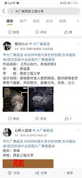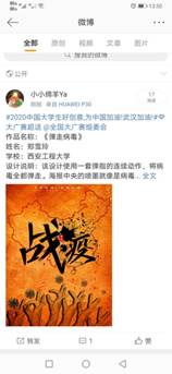 团总支的动员和专业教师的指导下,参加了由大赛组委会和中国网络视听节目服务协会发布的2020第十二届全国大学生广告艺术大赛公益命题《战“疫”》作品微博征集活动,既宣传了防控新型冠状病毒肺炎的知识,鼓舞了战疫士气,又训练了专业技能,丰富了居家学习生活。