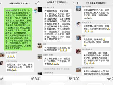 4月4日清晨起,各年级学子纷纷在线上发表哀悼图文、分享战“疫”纪实视频,表达缅怀。上午10:00,学生党员团员收看全国哀悼活动直播并进行哀悼,多个党支部、团支部组织了线上集体哀悼,并在哀悼活动结束后举行党团支部会议。