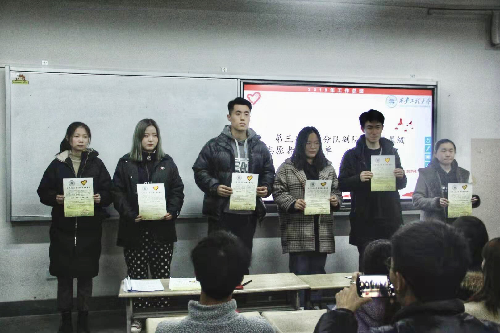 青年志愿者们一年来在校园内外举办了一系列志愿服务活动。急救知识宣传活动、消防安全系列宣传活动、环保服装设计及环保意识宣传活动、“大手拉小手,助力中国梦”助力贫困山区学子成长成才活动、临潼区斜口小学支教、校园双选会志愿服务、2019届毕业典礼志愿服务……一幕幕志愿者们认真工作的现场画面在会议开场视频中再次重现,感动台下每一位同学,尤其是2019级新入队的注册志愿者们。