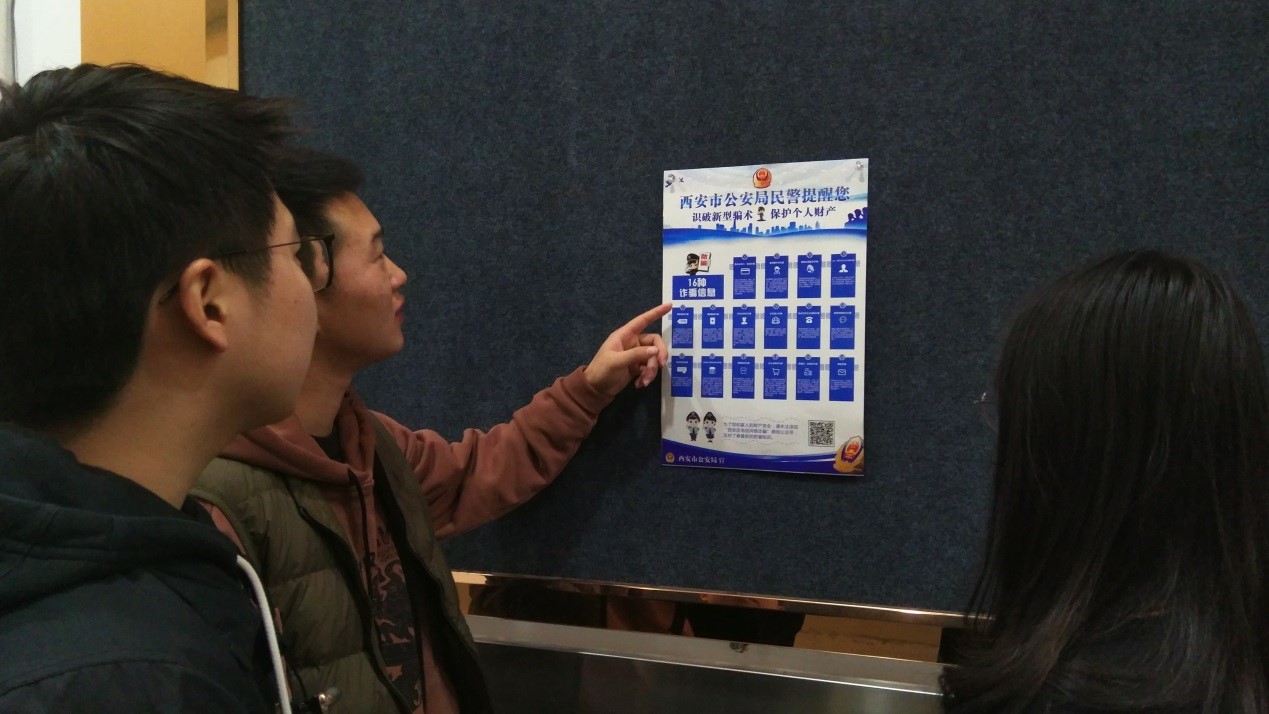 学生在公告栏前学习预防电信网络诈骗宣传材料