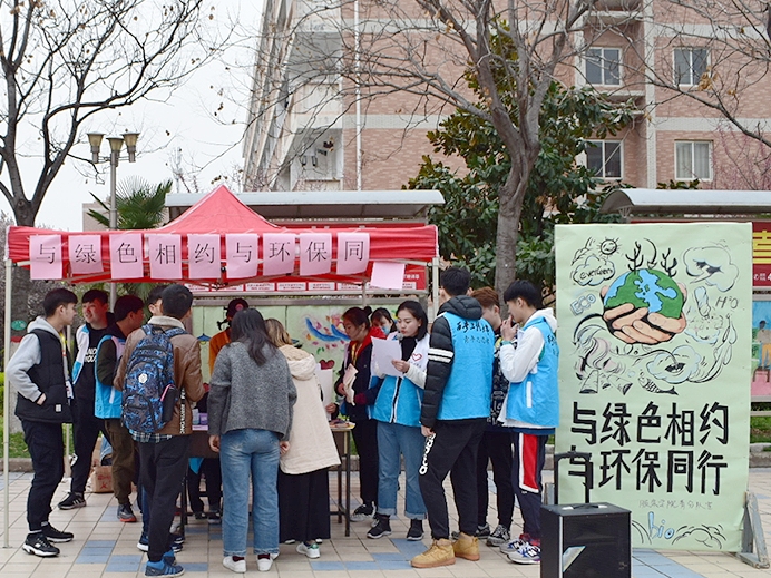 青分队在临潼校区中心广场开展了第十一届志愿者文化节“与绿色相约,与环保同行动”主题志愿活动。