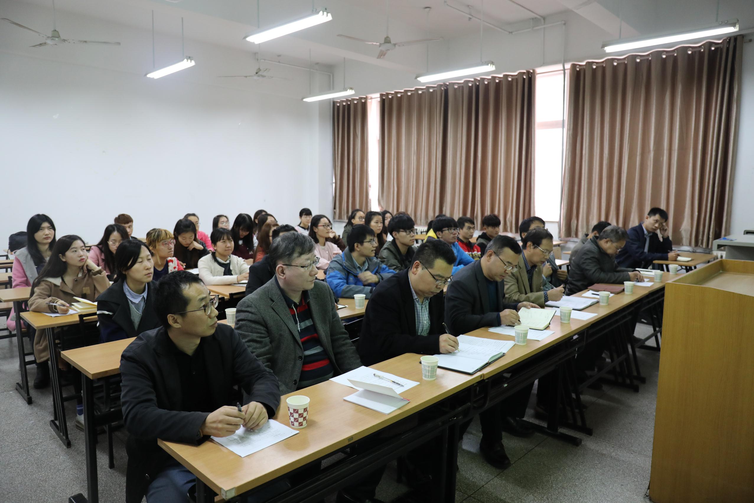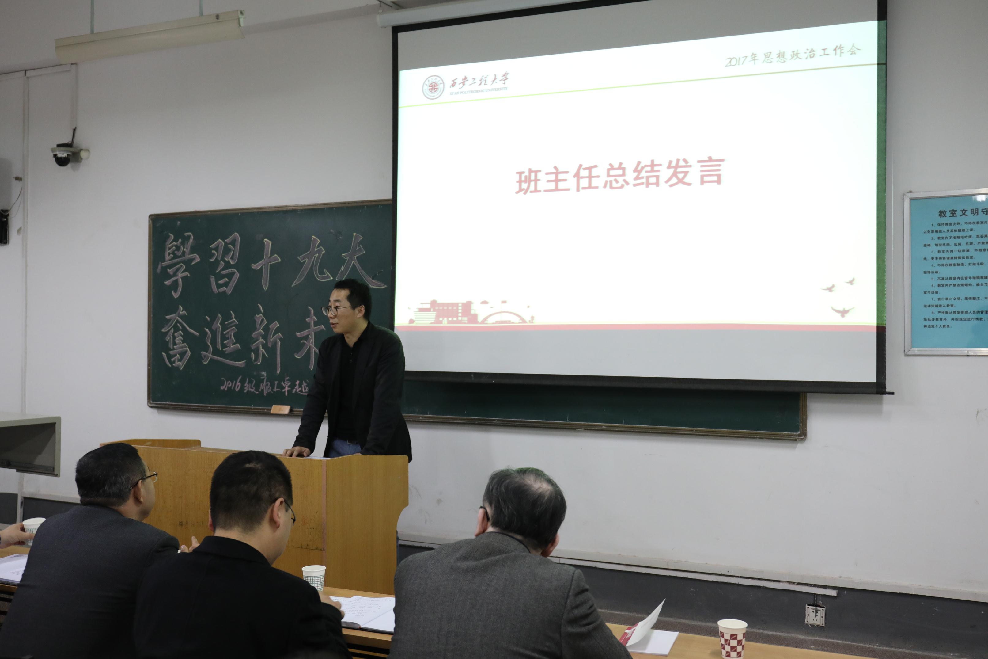 班主任高岭教授在认真聆听同学们的发言后,以一名老师的身份跟同学们进行了交流。他表示自担任本班班主任以来,一直想与同学们见面,了解情况,交流思想。本次班会安排在党的十九大刚刚闭幕这一重要时间节点,以“学习十九大,奋进新未来”为主题,班会内容充实,对同学们的精心准备表示肯定。对同学们交流的四个未来规划目标进行了逐一分析点评,并结合当前国内外大形势、大背景和学校第二次党代会的部署安排,对同学们在大学的学习生活提出四点期望:一是认真学习十九大精神和内容,进一步明确目标,把握时代机遇,不忘初心,不忘使命,继续奋进;二是把握好大学美好时光,尽快适应大学学习方法,变被动学习为主动学习,尤其加强学习方法、思维方法的学习,努力营造“比、学、赶、帮”的良好班风学风;三是树立创新意识,打破常规思维,积极解放思想,对现有知识和事物要敢于质疑、批判、探索和创新;四是努力丰富阅历,积极参加实践,提升综合能力,努力把握每次出彩机会,注重加强体育锻炼,保持身心健康。