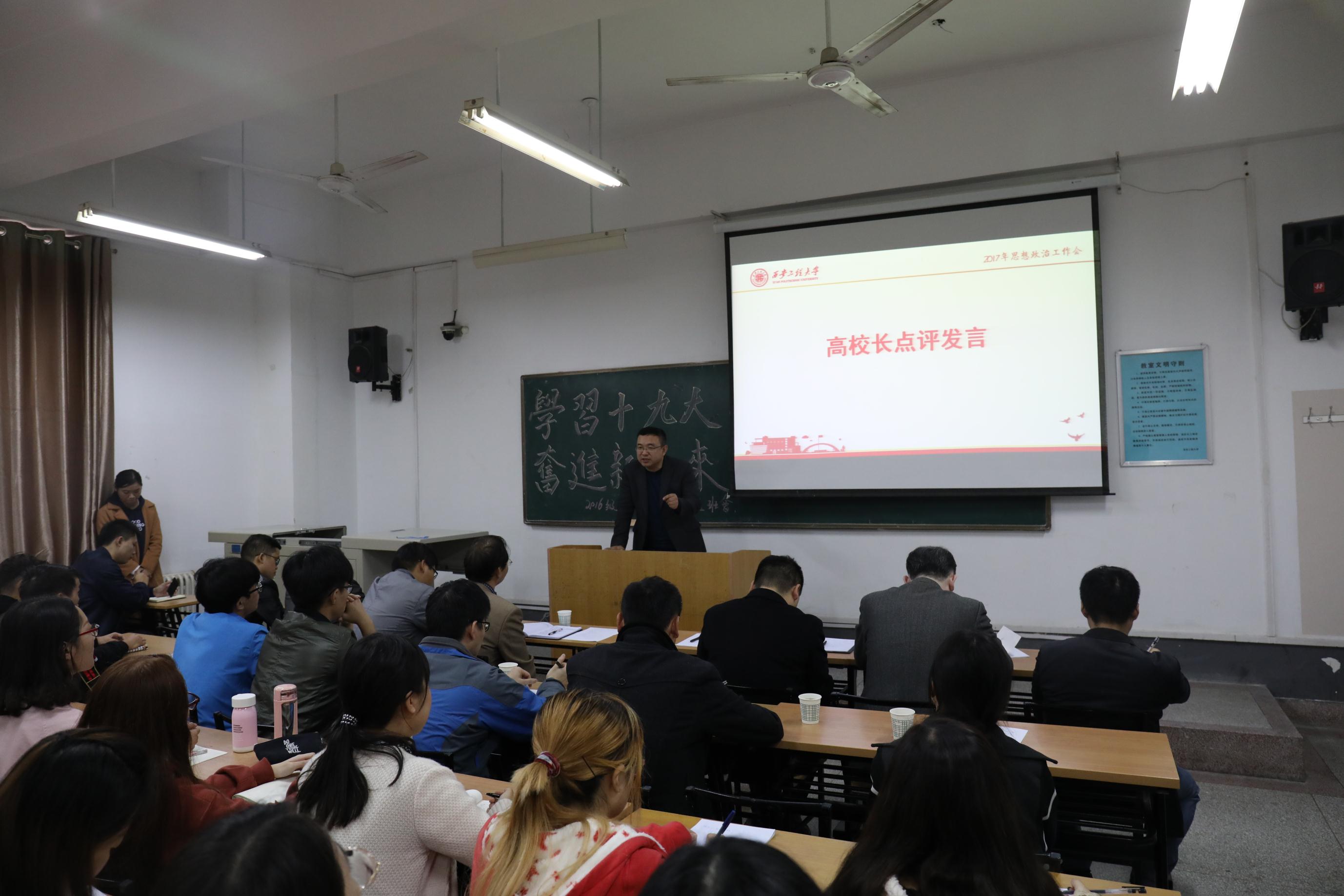 分管学生思想政治教育工作的校党委副书记赵小峰参加班会,他表示为了深入了解同学们的学习生活情况,听取同学们对学校教学管理等各方面工作的意见建议,更好的服务同学们成长成才,同时,为做好十九大精神宣传贯彻和基层党支部建设,根据校党委安排,校领导分别联系基层教工、学生党支部和学生班级,其中校领导联系并担任班级班主任的,该班级配备两名班主任,其中一名负责班级日常工作。下一步,学校将充分挖掘发挥教授、博士、青年教师在学生思想教育引领作用,逐步构建起学校全员、全方位、全过程育人的体制机制,始终坚持立德树人、以生为本,把全国、全省高校思想政治工作会议精神落到实处。随后结合十九大精神和社会发展对人才需求,对同学们提出三点希望:一是学好专业知识,增强专业自信,打牢服务社会国家的本领;二是建立同学成长档案,积极开展各类活动,营造优良班风;三是关心关注学校发展,以主人翁的精神对学校工作多提意见和建议。