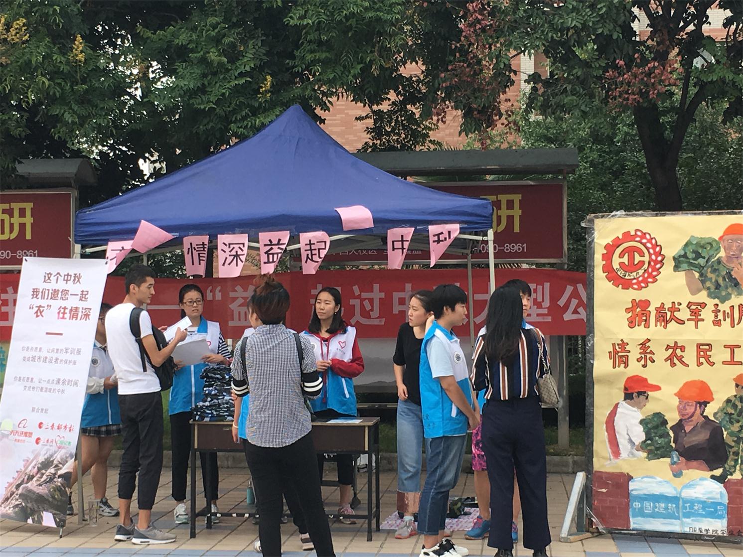 在进行充分的海报宣传、网络平台宣传后,21日上午10:00活动正式开始,同学们积极踊跃地参与,纷纷将自己清洗干净的新生军训服装捐出。对于军训服“制造-销售-使用-闲置-丢弃”的命运,同学们纷纷表示惋惜,而本次活动将闲置军训服装捐赠给有需要的建筑工人,进行可持续回收利用的做法得到了大多数同学的支持。活动同时还公开召集公益组织,计划组织志愿者九月下旬走进建筑工地,向建筑工人推送文艺节目,和他们一起提前过中秋。